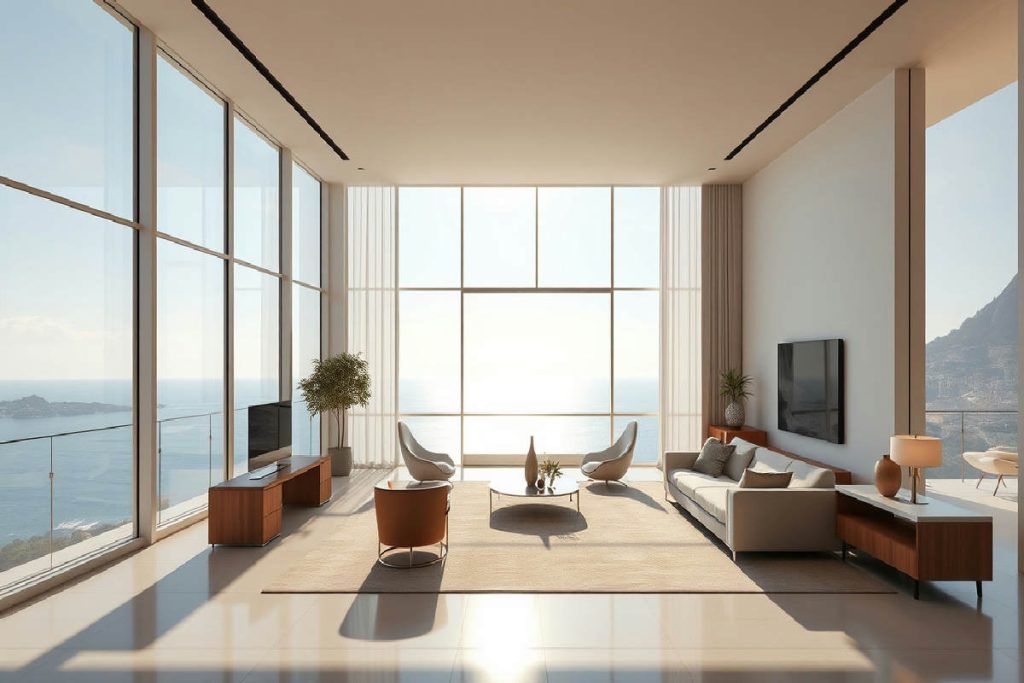 Nel Principato di Monaco, l’appartamento di Greggio si distingue soprattutto per come il confine tra dentro e fuori sembra sparire. La struttura, audace e scenografica, si basa su grandi vetrate a tutta altezza. Queste pareti di cristallo non si limitano a offrire la vista sul Mediterraneo: incorniciano il panorama e catturano i colori che cambiano col passare del giorno, dal blu profondo dell’alba ai toni caldi del tramonto. Il risultato è un quadro in movimento, uno spettacolo che entra in casa e ne tocca ogni angolo. La luce naturale non si limita a entrare: si riflette su superfici lucide, metalli e legni pregiati, dando un senso di spazio e libertà.
